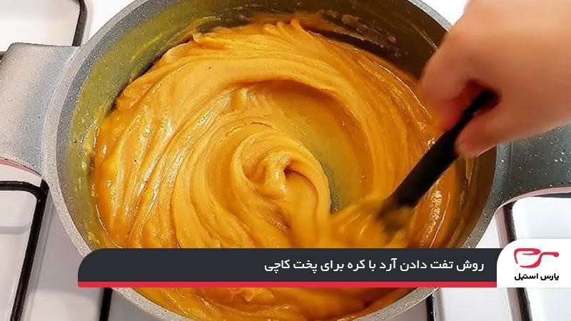 برای تهیه کاچی مخصوص پریودی با شیره انگور، ابتدا آرد را روی حرارت ملایم حدود ۵ دقیقه تفت دهید تا بوی خامی آن از بین برود. سپس مقداری کره یا روغن حیوانی اضافه کرده و تفت دادن را ادامه دهید تا آرد طلایی شود. حالا ادویههایی مثل زنجبیل، هل، زردچوبه و کمی دارچین را اضافه کرده و خوب هم بزنید.